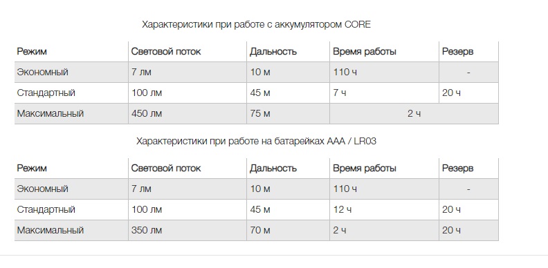 - Питание: аккумулятор CORE (входит в комплект) или три батареи AAA/LR03